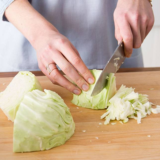 6. Tempatkan potongan kubis, sisi rata ke bawah dan iris menjadi pita dengan pisau, atau gunakan mandolin dengan lampiran pengaman untuk memotong yang paling rata.